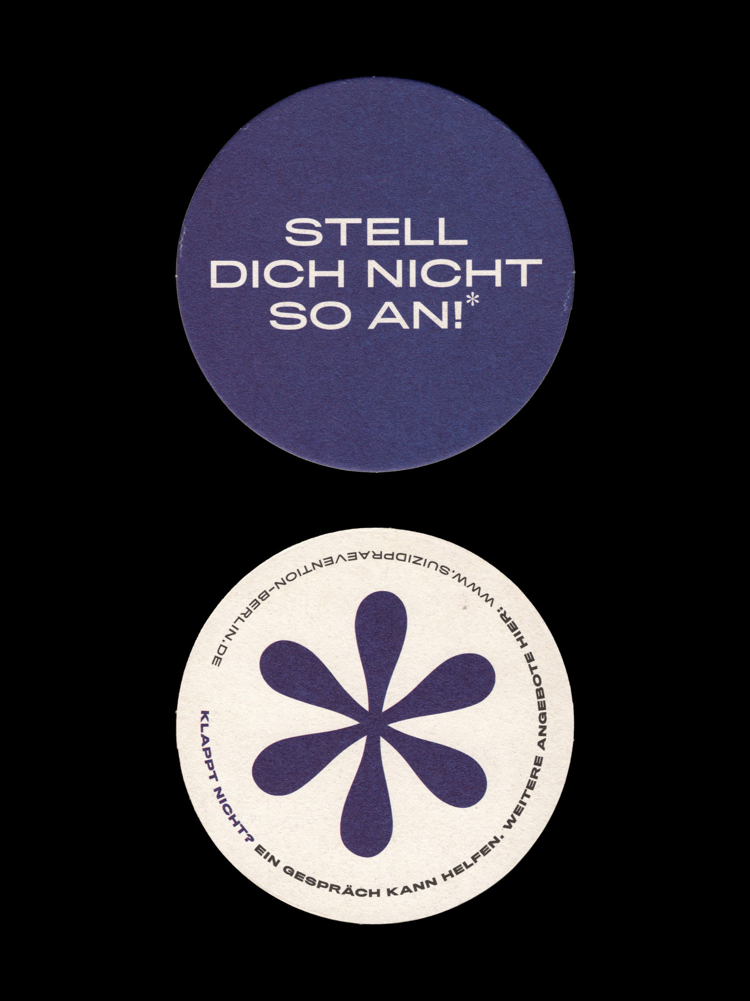 Am 10. September ist Welttag der Suizidprävention. Im Zuge dessen ist für den Caritasverband Berlin in Zusammenarbeit mit u25 Deutschland eine kleine Out of Home Kampagne entstanden. Die Wahl von Bierdeckeln als Medium ermöglicht eine ungezwungene Art das Thema in den öffentlichen Raum und an die Menschen heran zu tragen. Plakative und vor allem nicht hilfreiche Floskeln auf der einen Seite treffen auf ein ernstes und echtes Gesprächsangebot auf der Rückseite. Ziel ist es, das Thema Suizid zu enttabuisieren und Menschen zu ermutigen, offene Gespräche zu führen und Hilfe in Anspruch zu nehmen. (Telefonseelsorge, 24 Stunden erreichbar, 0800 1110111)