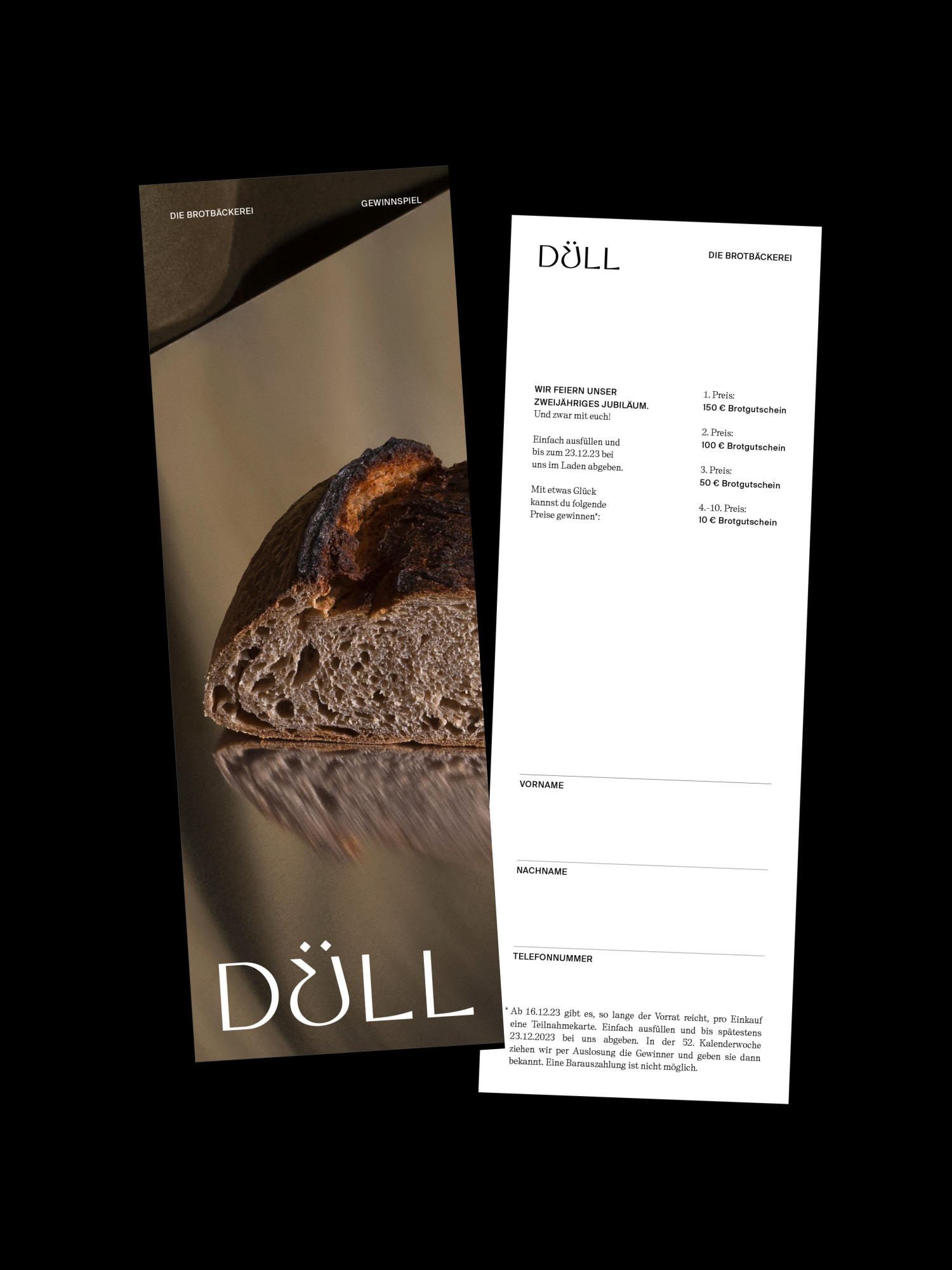 Düll ist eine Bäckerei in Würzburg mit einem besonderen Konzept: Es gibt sechs Brote. Die Darstellung dieser Brote nimmt die zentrale Rolle des Brandings ein. Durch sechs Fotografien wird die Geschichte des jeweiligen Produktes erzählt und der Geschmack sowie der Charakter jedes einzelnen Brotes visualisiert. Ergänzt wird das Erscheinungsbild durch eine prägnante Wortmarke, welche stringent auf allen weiteren gestalteten Medien, wie Schaufenster, Packaging, Visitenkarten und Tragetasche plakativ zum Einsatz kommt.