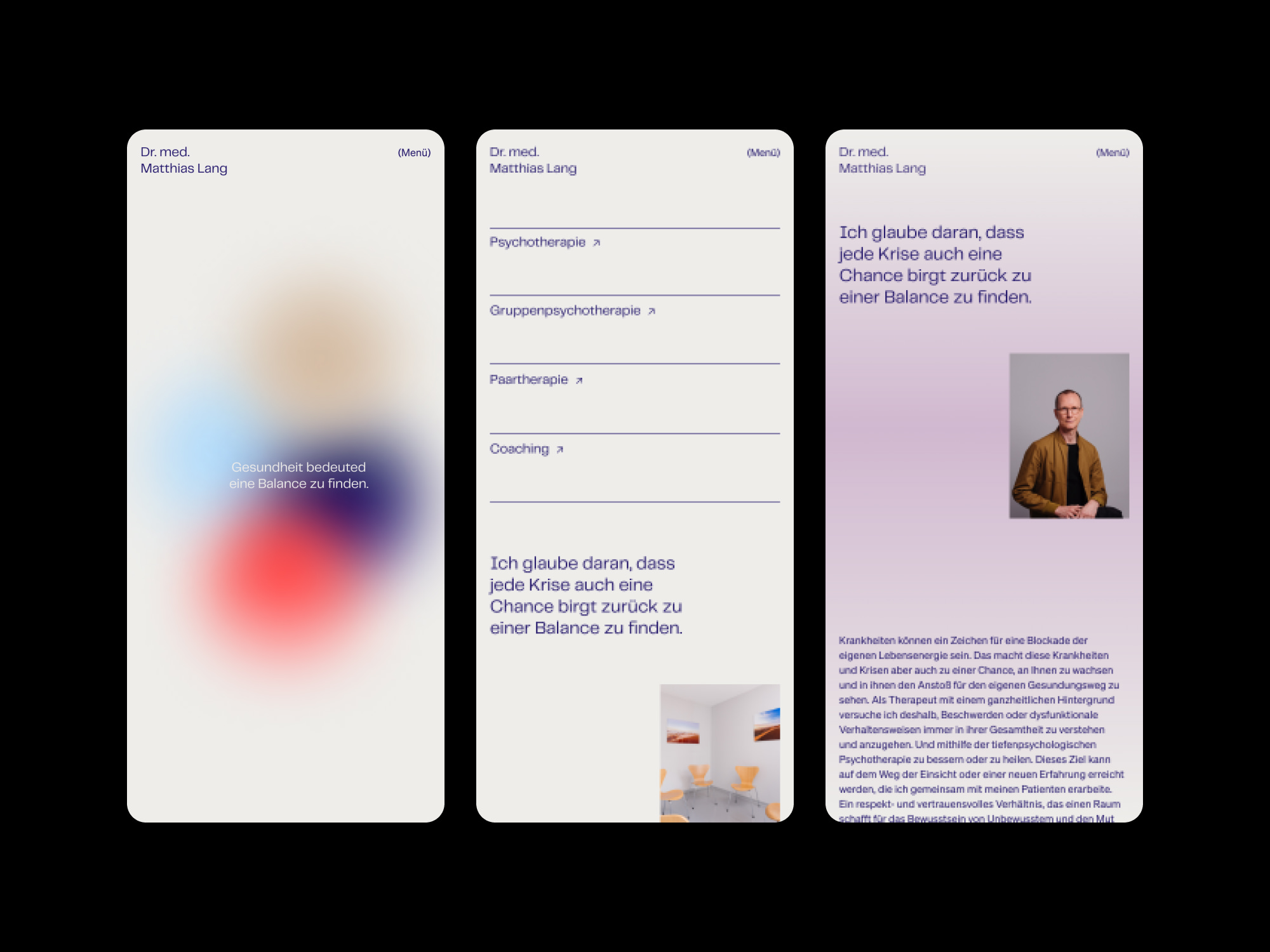 Für den Kölner Psychotherapeuten Matthias Lang ist eine Website entstanden, die potentielle Patient*innen informiert. Unter dem Motto „Gesundheit bedeutet eine Balance zu finden“, visualisieren gestalterische Elemente und Animationen die Themenschwerpunkte und Arbeitsweise des Therapeuten. Die Farbigkeit der Seite spiegelt nicht nur seine persönliche Art sondern auch das unkonventionelle Interieur seiner Praxis wider.